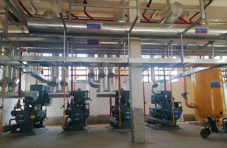 技術(shù)實(shí)現形式:制冷主機采用系統選用一臺自帶經(jīng)濟器液氟冷卻螺桿并聯(lián)機組3*HSN8571-125;供液方式選用1臺桶泵機組ZWF8.2,循環(huán)桶容積8.2立方米,配置2臺屏蔽冷媒泵; 1臺SPL-1490蒸發(fā)式冷凝器;虹吸罐選用1臺HG0.7,容積700L;冷間內蒸發(fā)器選用兩翅鋁合金翅片管,鋁排蒸發(fā)器采用熱氟融霜;