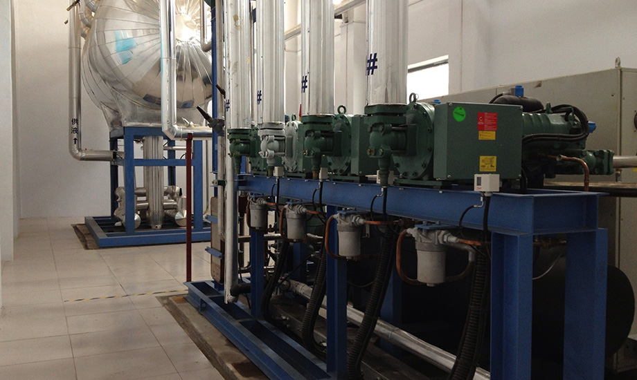 技術(shù)實(shí)現形式:制冷系統冷源采用一套滿(mǎn)液式低溫螺桿并聯(lián)制冷機組,壓縮機為德國比澤爾半封螺桿壓縮機,制冷劑采用 R22, 機組配一臺蒸發(fā)式冷凝器,型號為:SWL-900,供液方式采用桶泵供液,末端蒸發(fā)器采用上下雙翅型鋁排管。